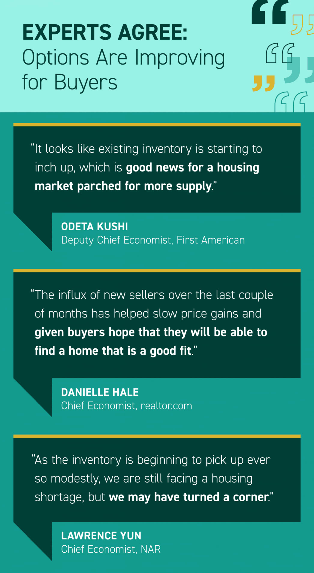 • Buyers hoping for more homes to choose from may be in luck as housing inventory begins to rise. Many experts agree – new sellers listing their homes is great news for buyers and the overall market.